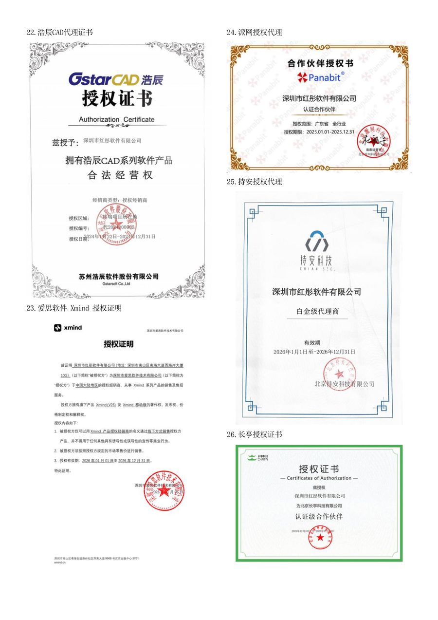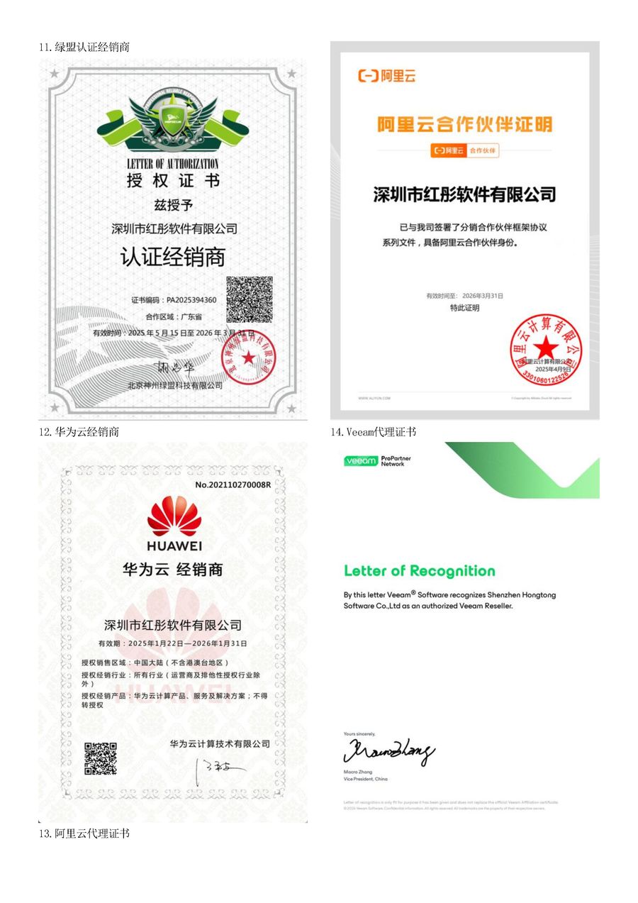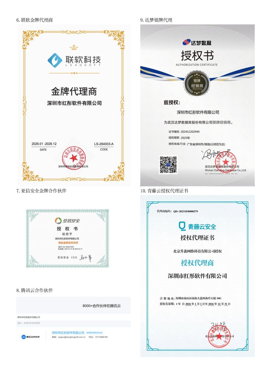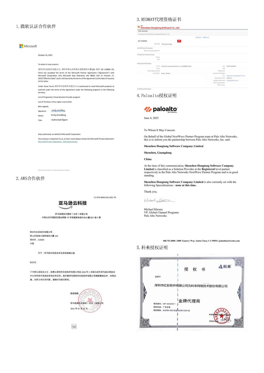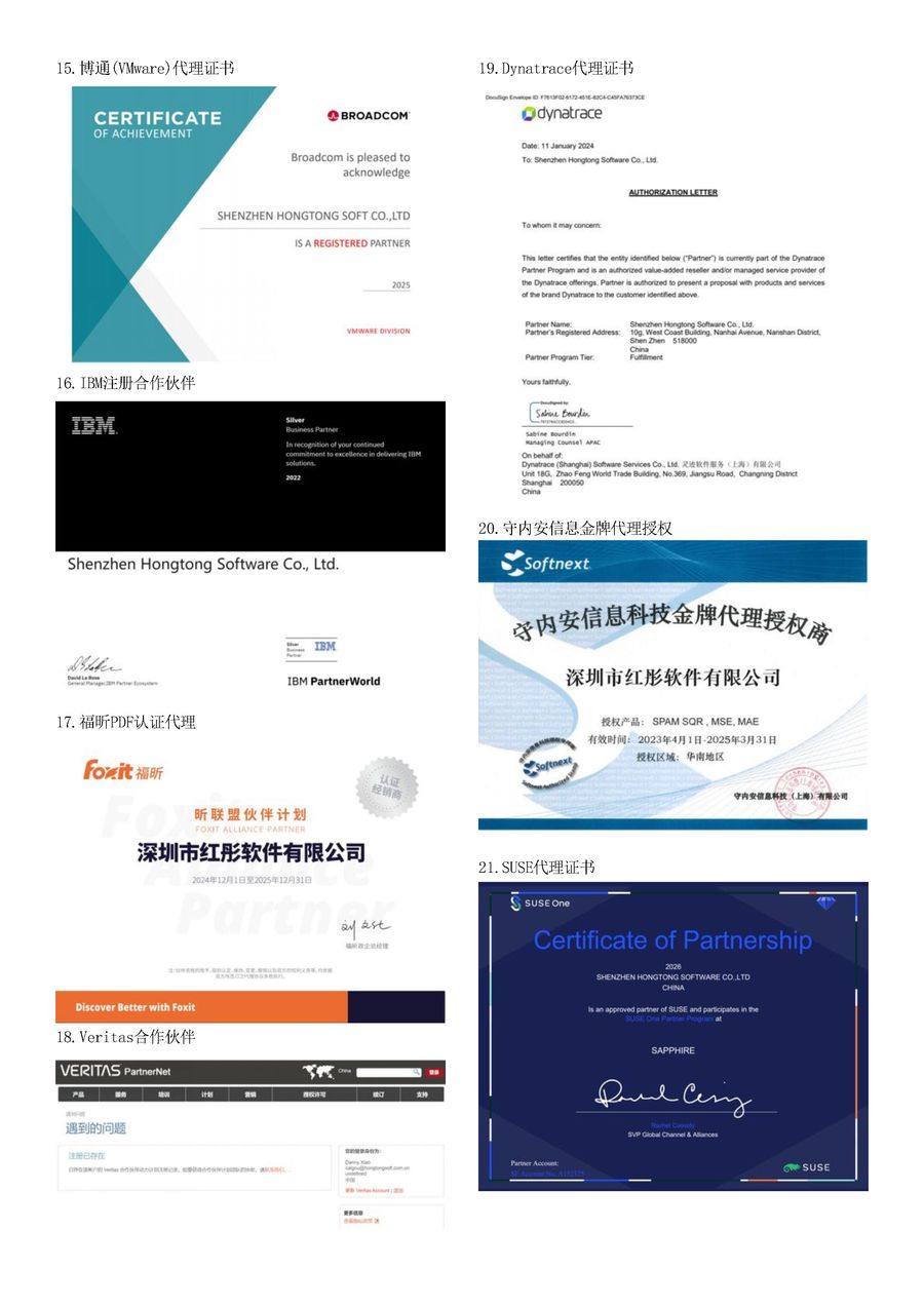 深圳市红彤软件有限公司的部分代理资质如下:微软认证合作伙伴、AWS合作伙伴、REDHAT代理资格证书、Paloalto授权证明、科来授权证明、联软金牌代理商、亚信安全金牌合作伙伴、达梦银牌代理、青藤云授权代理证书、绿盟认证经销商、华为云经销商、阿里云代理证书、Veeam代理证书、博通(VMware)代理证书、IBM注册合作伙伴、福昕PDF认证代理、Veritas合作伙伴、腾讯云合作伙伴、Dynatrace代理证书、守内安信息金牌代理授权、SUSE代理证书、浩辰CAD代理证书、爱思软件 Xmind 授权证明、派网授权代理、持安授权代理、道客授权代理、金蝶天燕授权证书、奇安信代理证书、长亭授权证书、深信服授权证书等。
