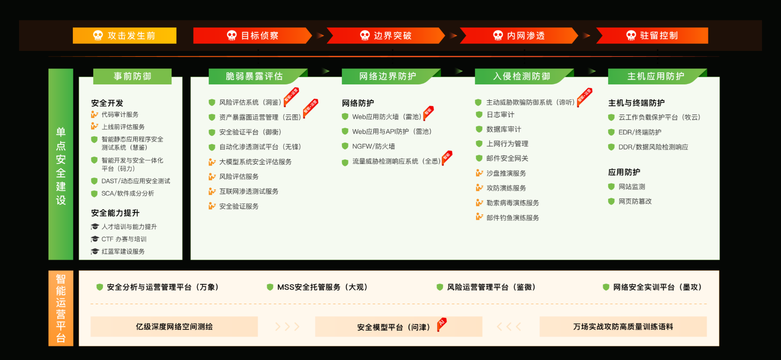 面向数字时代的新型安全风险,长亭科技立足实战攻防能力,为用户带来以下一代 Web 应用防火墙、安全评估系统、安全验证平台、高级威胁分析预警系统、安全分析与管理平台、资产暴露⾯管理平台、主机安全管理平台、伪装欺骗系统、安全大模型等产品为核心的新一代安全防护体系,并通过优质的安全测试及咨询服务,为客户提供实战化、体系化、常态化的智能安全运营解决方案。