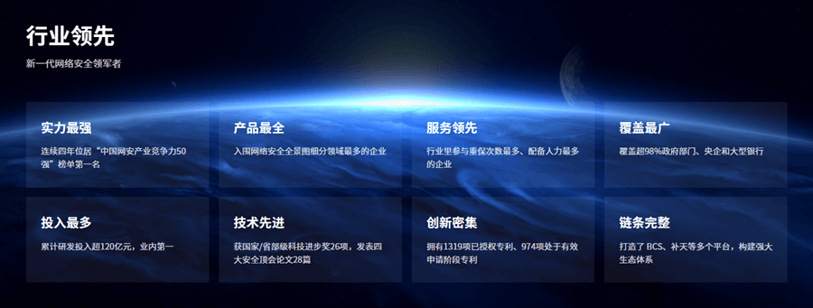 作为网络安全国家队,奇安信立志为国家构建安全的网络空间。安全理念方面,奇安信提出的“数据驱动安全”“内生安全”“经营安全”“网络安全零事故目标”“数智安全”“AI驱动安全”等先进理论,成为国内网络安全和数据安全发展新的风向标,为网络安全技术进步做出了突出贡献。技术能力方面,奇安信在终端安全、云安全、威胁情报、态势感知等领域的技术先进性及市场占有率排名持续领先;业务领域方面,奇安信是全领域覆盖的综合型网络安全厂商,连续多年蝉联《网络安全行业全景图》入选最多企业;在中国网络安全产业联盟(CCIA)发布的 2021 年、2022 年、2023 年、2024 年“中国网安产业竞争力五十强”榜单中,奇安信连续四年排名第一。