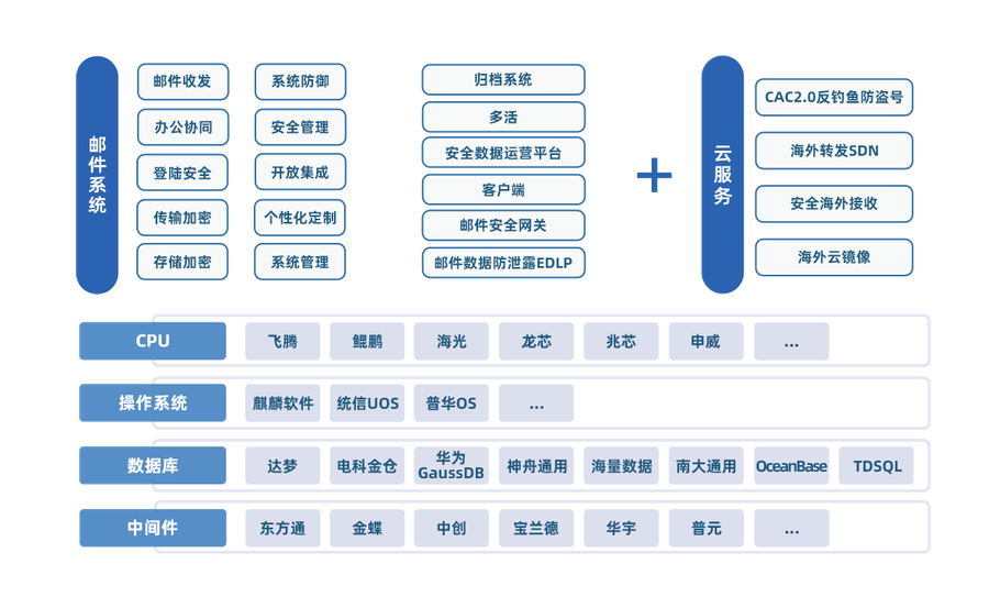 Coremail邮件系统是自主研发的大型企业邮件系统,是中国第一套中文邮件系统,目前在中国大陆地区拥有超过10亿终端用户。经过27年的深入研发和完善,系统技术成熟,性能稳定高效,能充分发挥邮件服务器性能,是众多知名企业及政府高校搭建邮件服务器系统及企业邮箱的首选方案。Coremail邮件系统全面适配信创环境,经过26年的深入研发和完善,系统技术成熟,性能稳定高效,能充分发挥邮件服务器性能,是众多知名企业及政府高校搭建邮件服务器系统及企业邮箱的首选方案。XT6邮件系统开创邮件系统虚拟化新潮流和引领多终端协同办公的新趋势,全面提升用户使用体验,促进企事单位信息化运营,为客户提供了更安全、更高效、更可靠的选择。