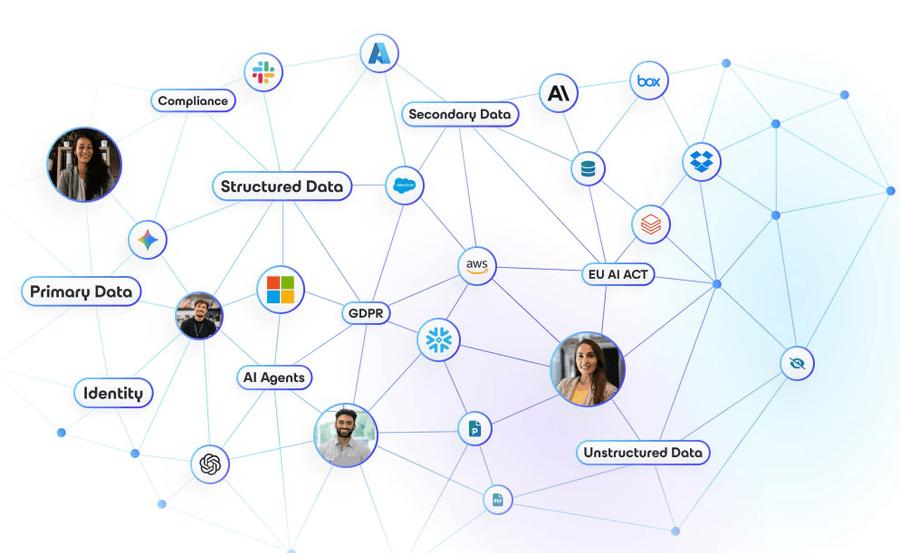 洞悉无处不在的数据:Data Command Graph(数据指挥图)可映射所有数据 —— 包括结构化、非结构化、主要或次要 —— 并通过将其与在整个生命周期中接触到数据的每个身份、AI模型和系统相连接,提供丰富的背景信息。让暗数据重见光明。精准洞察潜在风险,清理冗余过时数据,基于单一可信数据源实现精细化运营。